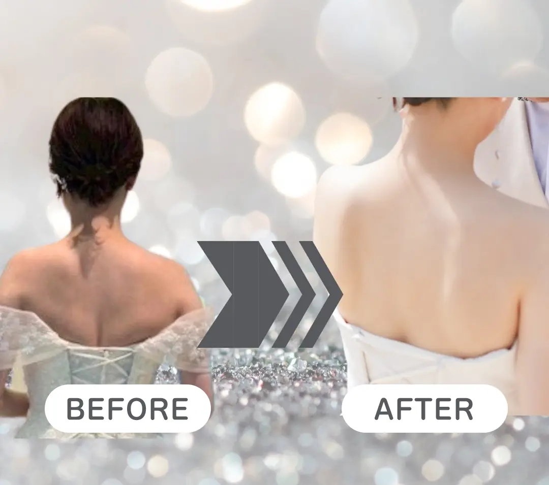 姿勢と構造を知り尽くした専門の手技で、埋もれた肩甲骨を調整し、ドレス姿で際立つ感動的な「天使の羽」を出現させます。
